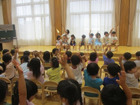 今月は『むすんでひらいて』の曲に合わせて、「上に♪」は両手を上にあげておひさまキラキラ。「横に♪」は飛行機ブンブン。「下に♪」は両手を床についてカエルがピョンピョンと跳ぶのを楽しみました。